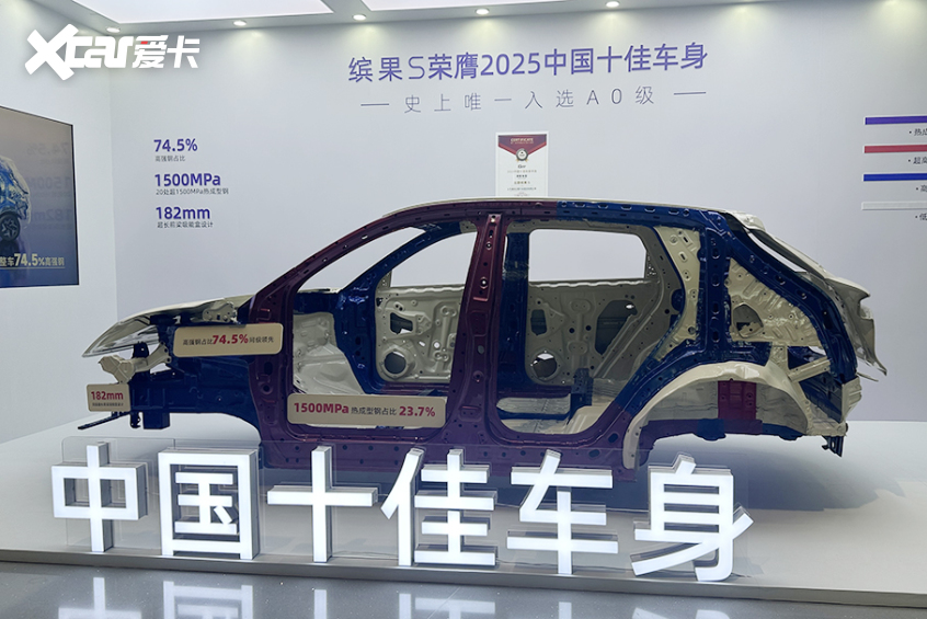 缤果S成功斩获2025中国十佳车身大奖,成为十佳车身评选有史以来唯一获此殊荣的A0级车型。基于天舆架构M平台打造,白车身高强钢用料比例高达74.5%,热成型钢比例实现23.7%的越级占比,A0级最优。高强钢应用荣获冶金科学技术奖一等奖,20处超过1500兆帕的高强度热成型钢分布在门环、左右门槛、左右后大梁等关键区域,确保了车身整体的强度和刚性表现,并全系标配主副驾驶安全气囊和侧气囊。